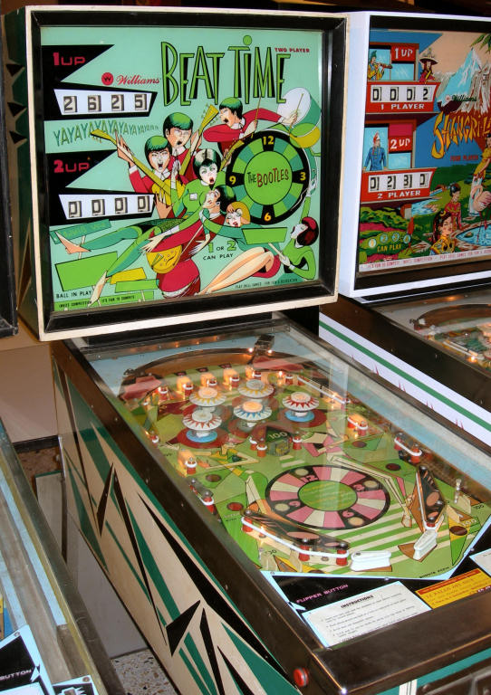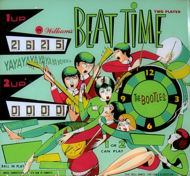Beat TimeLe lien vers la fiche: www.ipdb.orgPrésentationFlipper Williams 2 joueurs électromécanique de 1967 sur le thème des Beatles, c'est un plagiat à peine caché le nom du groupe ayant été changé en 'Bootles'.Ce flipper ne m'appartient pas, il m'a juste été prêté pour que je puisse l'amener au salon de Sorgues 2007: www.flipsud.comLa vitre est en état collector, quasi neuve comme vous pouvez le voir, pas mal pour un flip de 40 ans: