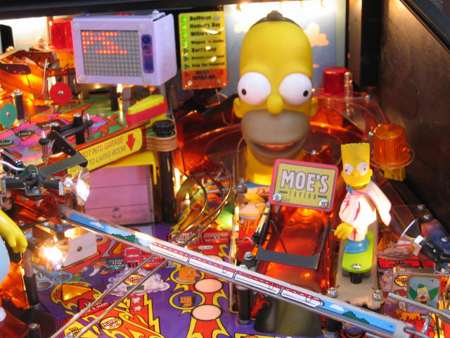 Le plateau est bien aéré au centre, les bumpers sont placés sur la gauche, comme sur le Star Wars ou le Twilight Zone. On a droit en face à une rangée de 3 cibles tombantes qui masquent un trou éjecteur (Kickout Hole). Bart recule sur son surf quand on touche la bille captive, Homer bouge la tête et s'illumine, et la porte du garage permet d'accéder au mini plateau supérieur. A gauche d'homer une rangée de leds indique les modes effectués et une mini-TV à led 3 couleurs affichent des petites animations et des messages.