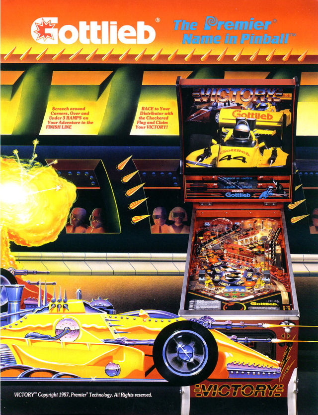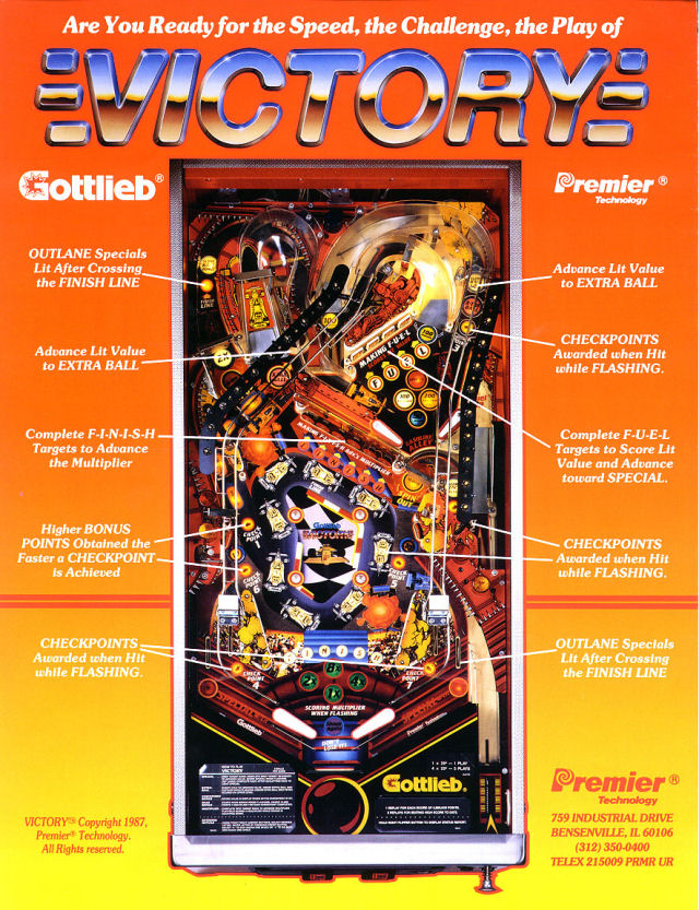 Victory (Gottlieb Premier - 1987)Le lien vers la fiche: www.ipdb.orgPrésentationFlipper Gottlieb Premier Sys80B de 1987 sur le thème des courses automobiles.Le but est d'atteindre tous les check points disséminés sur le plateau dans l'ordre et de terminer la course. Bruitage et mini-plateau sympa et pas mal de rampes. C'est un flipper assez coloré et bien éclairé, plaisant à jouer. Le plateau est imprimé sur une feuille de plastique et collé d'origine ce qui le rend très solide.Le flipper n'étant resté que quelques jours en "transit temporaire" à la maison j'ai pu y faire quelques parties mais j'ai oublié de faire des photos, voici simplement le flyer récupéré sur www.ipdb.org :